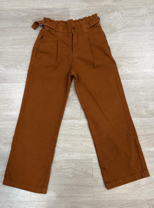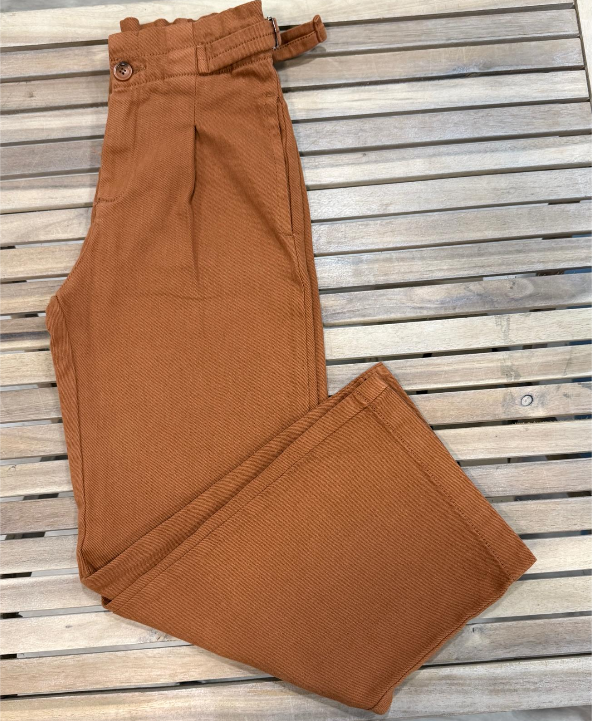 O tom marrom é uma alternativa moderna ao jeans tradicional, permitindo criar conjuntos originais sem perder a neutralidade. Um dos destaques desta calça são os detalhes com fivela lateral, que acrescentam um toque diferenciador ao visual, tornando a peça mais interessante e atual. Estes pormenores decorativos valorizam o design sem comprometer a liberdade de movimentos.