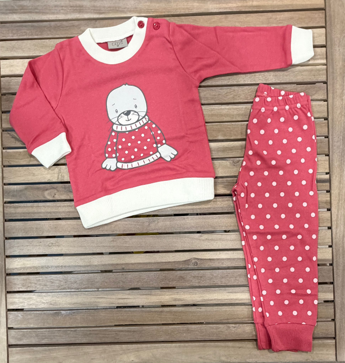 Conjunto de pijama rosa para menina, com camisola com desenho fofo e calça com bolinhas brancas. Confortável, macio e ideal para bebés e crianças até aos 2 anos. Stock limitado: apenas 8 conjuntos disponíveis nos tamanhos 6 meses, 12 meses, 18 meses e 2 anos.