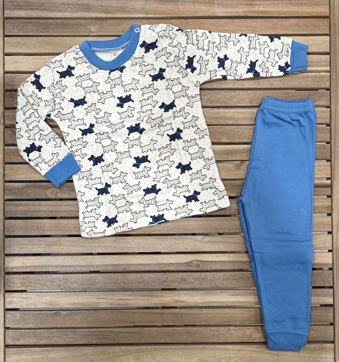 Conjunto de pijama para menino em branco e azul, com desenhos fofos de cachorrinhos na camisola. Confortável, macio e ideal para bebés e crianças pequenas. Disponível em stock limitado nos tamanhos 12, 18, 24 e 36 meses.
