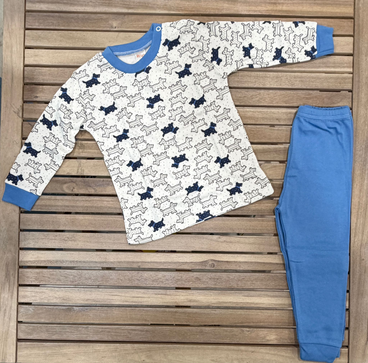 Conjunto de pijama para menino, ideal para noites confortáveis e cheias de ternura. Em tons suaves de branco e azul, este conjunto destaca-se pelos desenhos fofos de cachorrinhos na camisola, um detalhe encantador que agrada tanto às crianças como aos adultos.